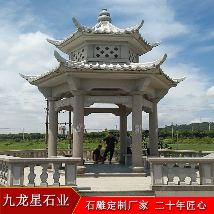 從形狀上來說,有四角涼亭、六角亭,八角涼亭,扇形涼亭,雙層涼亭,三層涼亭。石雕涼亭是蓋在路旁或花園里供人休息用的建筑物,面積較小,大多只有頂,沒有墻。用來點綴園林景觀的一種園林小品。不同材質的石雕涼亭報價也就不同。