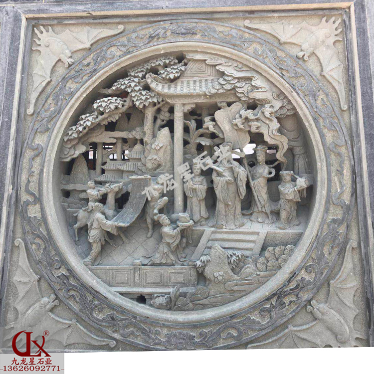 寺廟墻體浮雕的美在于它是一種特殊的雕刻,是一種在平面上進行雕刻制作出帶有凹凸感起伏形象的一種特別的雕塑,青石浮雕雕刻的特色在于雖然是在平面上刻畫的,但是它的美帶給人的不關是視覺上的還有觸覺上的,是一種雙重享受。從藝術鑒賞的角度來看, 寺廟墻體浮雕制作將繪畫與圓雕相互融合,取其精華取其糟粕,把繪畫中對于構圖以及空間處理、意境描繪的優(yōu)勢發(fā)揮的很好,這樣就彌補了圓雕無法表現(xiàn)出內容、環(huán)境等具有連續(xù)性和復雜多變的場景的缺點。