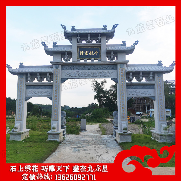 墓地用石牌坊圖片樣式的設計吸收了中國傳統(tǒng)房屋建筑的結(jié)構,融合了屋頂、斗拱的部件,更具有大氣和磅礴的設計感。墓園牌坊大門的設計分類比較多,主要可以分為沖天式和不出頭式,在設計上還加入了諸如箍頭、火焰、云頭、云尾以及抱鼓石、柱頂石等設計,根據(jù)不同地區(qū)的文化特色以及區(qū)域風土人情等,在牌坊的設計上也會有不同的特色展示。