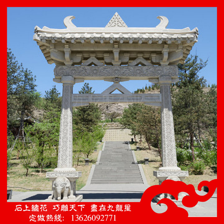 石牌坊的種類很多,單門牌坊也是較常見的類別之一。常見的單門牌坊一般于步行街、村莊、景區(qū)入口較多。石牌坊這種古老建筑在設(shè)計(jì)形式上多種多樣,它雖然古老但是設(shè)計(jì)形式并不單調(diào),相反這種建筑設(shè)計(jì)還為現(xiàn)代設(shè)計(jì)提供了很多有益的借鑒。單門石牌坊作為牌坊的一個(gè)種類,在很多地方我們都可以見到它的身影,這種建筑相對(duì)來(lái)說(shuō)比較簡(jiǎn)單,但是可以起到很好的裝飾性作用。