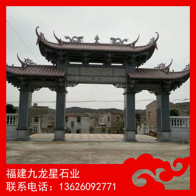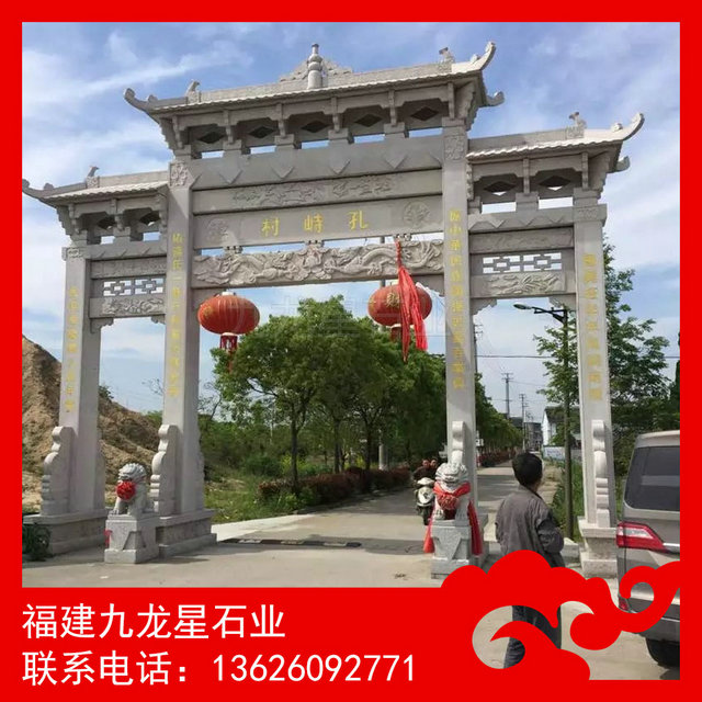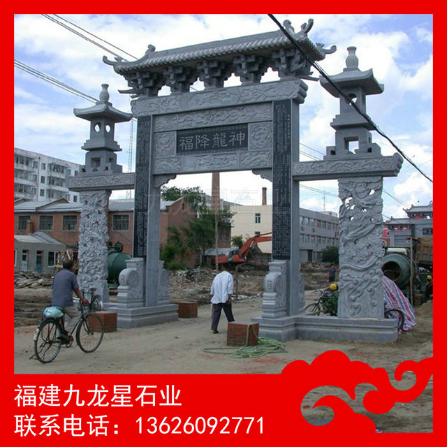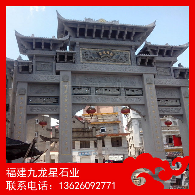 石雕牌坊 三門五樓石牌坊——石雕牌坊,也叫石雕牌樓、山門,漢族特色建筑文化之一。石雕牌坊用各種石料來進(jìn)行塑造,創(chuàng)造出具有一定空間的可視、可觸的建筑裝飾物,借以反映社會生活、表達(dá)意義。花崗巖石雕牌坊常用青石石雕牌坊、芝麻白石雕牌坊、銹石石雕牌坊等。大理石石雕牌坊則常用漢白玉石雕牌坊。根據(jù)需要來選擇材料制造石雕牌坊。石雕牌樓以景園、街道、陵墓前為多。