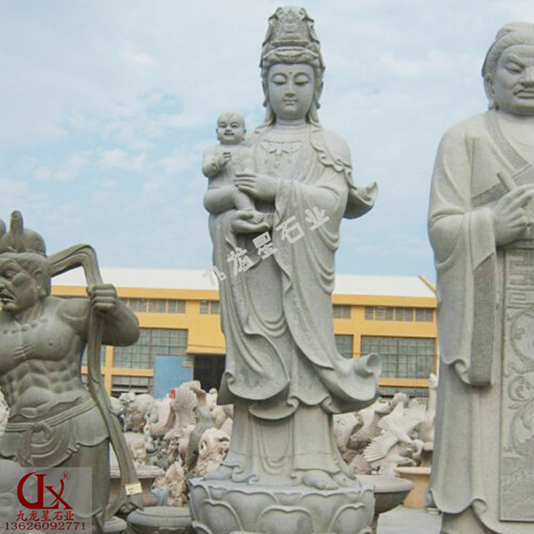 一般來說送子觀音石雕像的形態(tài)便是觀音菩薩在祥云之上,手抱一個小孩,后邊跟著一對金童玉女的形象存在,并且這種石雕廣泛應(yīng)用于寺廟,有的人家里也會擺放一尊,便利家里人能用忠誠的心感動菩薩,然后達到得“子”這個愿望。