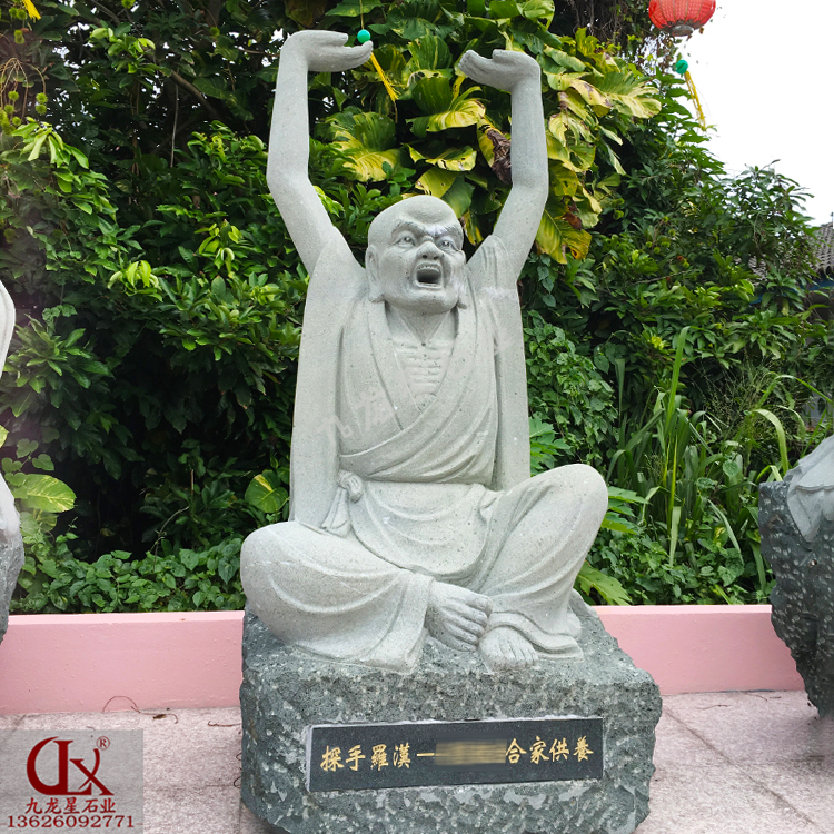 用于室外擺放的石雕十八羅漢坐像圖片通常建議用花崗巖石材雕刻,按順序擺放在兩側(cè)。漢傳佛教的的石雕十八羅漢隨著雕塑文化的發(fā)展,造型有立像、坐像、坐立結(jié)合的三種雕刻方式。