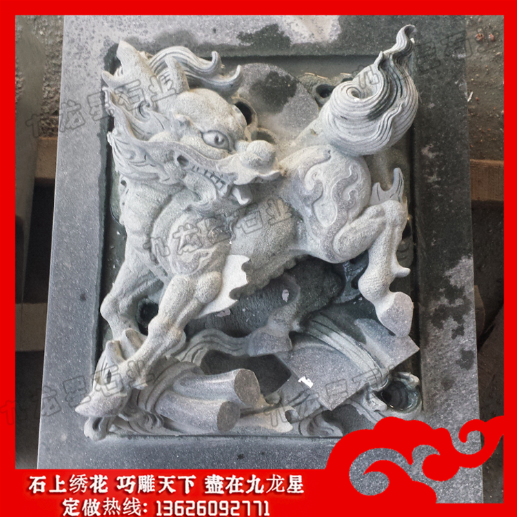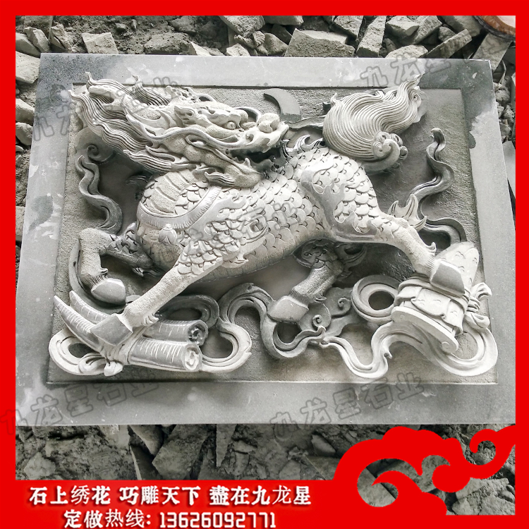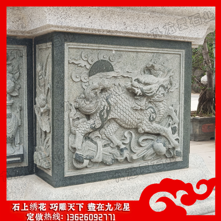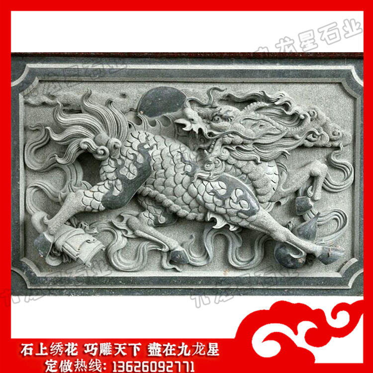 石材浮雕(石雕麒麟浮雕圖片 寺院墻面麒麟浮雕)——九龍星石業(yè)。