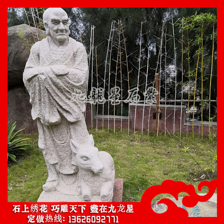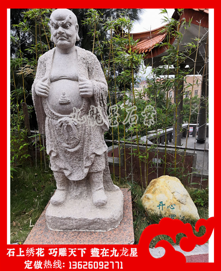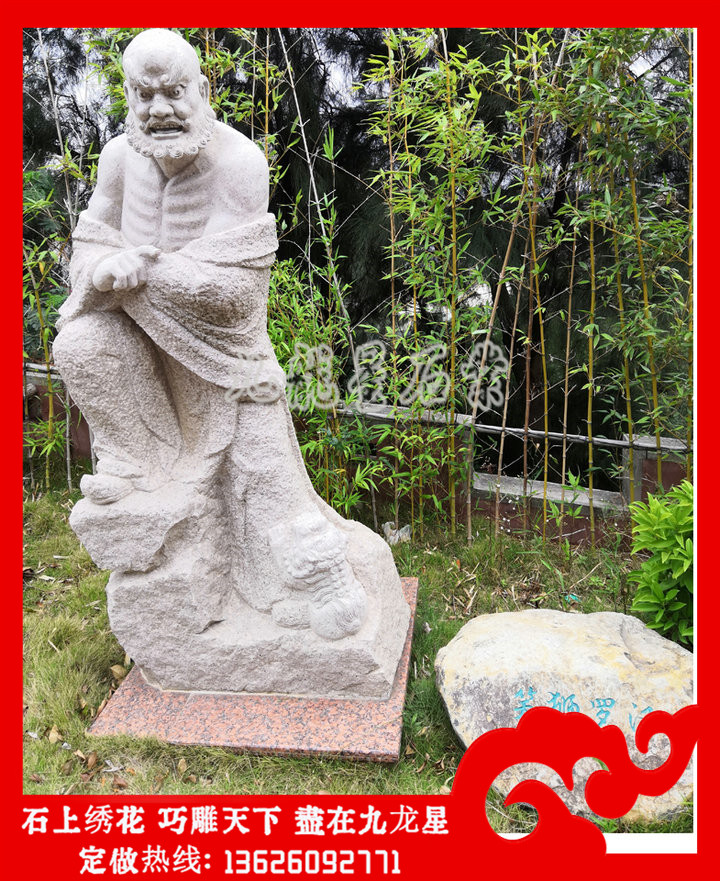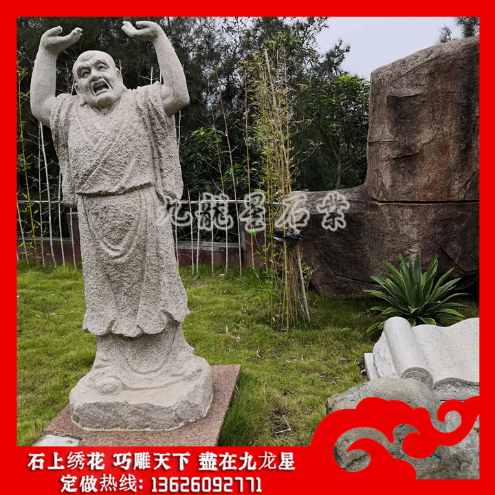 石雕十八羅漢每一尊羅漢象征的意義不一樣。相傳石雕十八羅漢是如來佛祖派到民間來傳播佛法,讓人們?cè)诜鹜訙缍群筮€有機(jī)會(huì)接觸佛法,在世間石雕十八羅漢造像與人相似,不斷的貼近人民的形象,使人們覺得有熟悉感,因此對(duì)其的信仰可以說也是普遍。信眾擺放家里的整套十八羅漢石雕擺件是比較小尊的,選材以花崗巖白麻石這類白色的亮系石材為主,而青色的石材比較不適合家居擺放佛像,一般是寺院選擇比較多,大理石漢白玉因?yàn)闈h白玉潔白的特性,在雕刻石雕十八羅漢神態(tài)形態(tài)視覺效果比較差,沒有花崗巖十八羅漢雕像整體的雕刻線條明顯,辨識(shí)度也比較低。因此家里擺放18羅漢造像擺件不建議選擇青石、漢白玉這兩種石材。