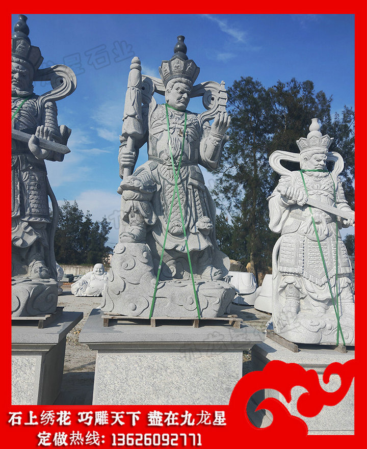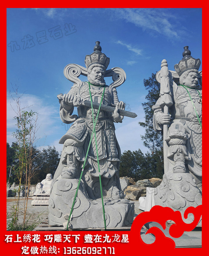 石雕四大天王尺寸價(jià)格常見的造型只有站像和坐像兩種,一般是單面造型。四大天王分別為護(hù)持東方國土東勝神洲的持國天王,護(hù)持南方國土南瞻部洲的增長天王,護(hù)持西方國土西牛賀洲的廣目天王,護(hù)持北方國土北俱蘆洲的多聞天王。由于石雕四大天王在佛教諸佛菩薩中承擔(dān)著護(hù)持佛法、降妖伏魔的職責(zé),因而其示現(xiàn)的造型通常身穿鎧甲,手持法器,各不相同。