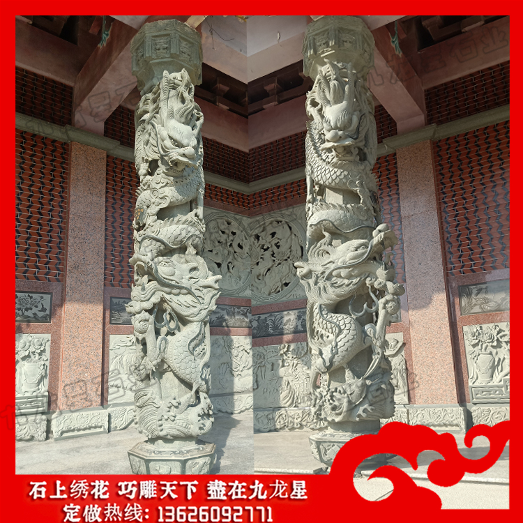 寺廟石龍柱雕刻常見的是被使用在家祠大殿前面走廊頂梁柱使用,一般是六根或者八根組成,這樣的石龍柱被稱之為大殿石龍柱。 大殿石龍柱常見的規(guī)格是直徑65厘米,高度制作到5.5米,由于大殿的走廊都非常的高,所以這個高度也是必要的,雕刻工藝基本上都是由一條龍盤旋而上的雕刻手法,其深度是龍柱直徑的十分之一左右。
