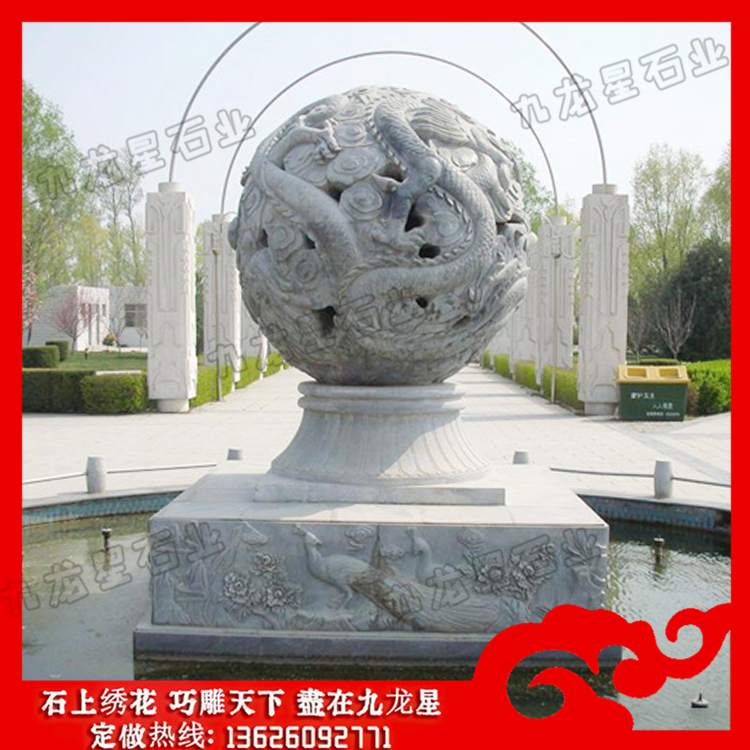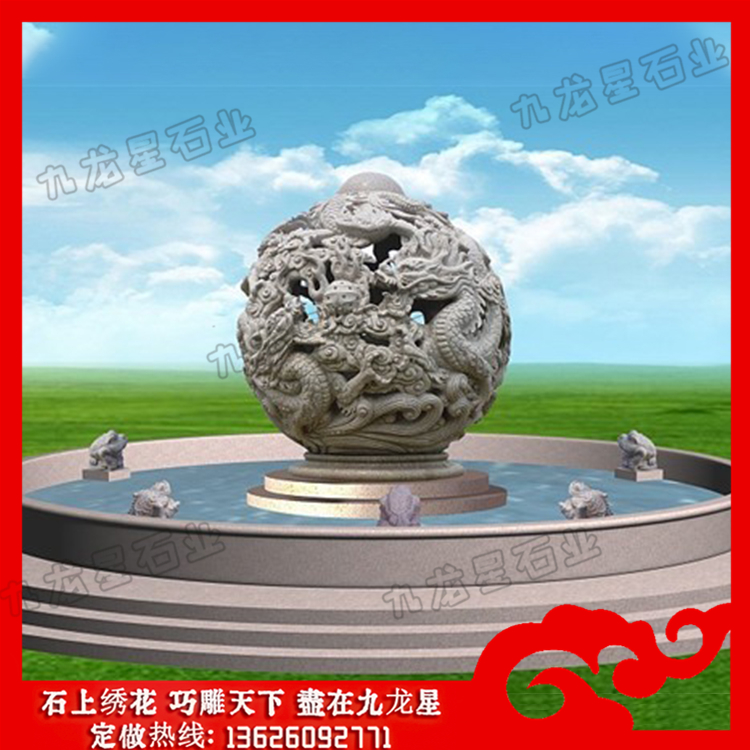 石雕龍球顧名思義就是在一個(gè)石球上雕刻滿龍浮雕,也可稱為石龍球、風(fēng)水球等。雕刻龍的石材風(fēng)水球加工的滾動工作原理為:在風(fēng)水球的底盤(柱)裝水,用水泵抽水向上噴而沖動上面的石球。風(fēng)水球轉(zhuǎn)動的身軀,代表著生命的靈動,不論單位或家中,只要有石雕龍球的轉(zhuǎn)動,代表風(fēng)生水起,財(cái)源滾滾。石雕龍球圖片的球轉(zhuǎn)水流,水為財(cái),石轉(zhuǎn)運(yùn)到,有財(cái)源滾滾,時(shí)來運(yùn)轉(zhuǎn)之意,而且其動感的效應(yīng),動靜融合,典雅怡人。