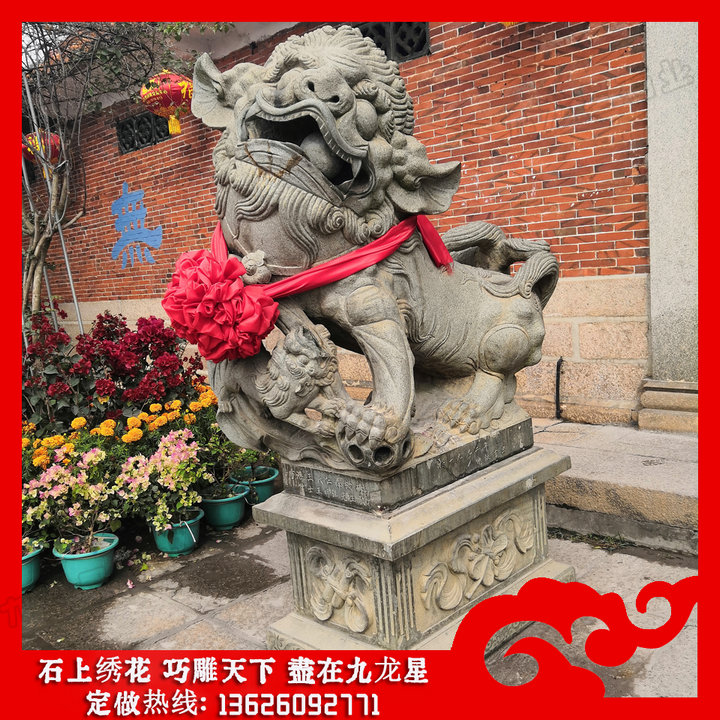 祠堂前石獅子的造型一般常飾一串古錢而得名,它是南方石獅當(dāng)中的一種造型。獻(xiàn)錢獅寓有招財進(jìn)寶之意,造型可愛乖巧,富有靈性。它是民間最為常見的一種石頭獅子造型之一,常擺放于寺廟或是祠堂門前。祠堂前石獅子的獻(xiàn)錢獅一般也為雌雄一對,雄獅常飾于大串的銅錢,寓意招財進(jìn)寶。而雌獅則戲玩著小獅子,寓意人丁興旺之意。