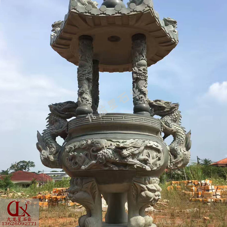 石雕香爐現(xiàn)貨其用途亦有多種,主要是用于敬神供佛,祭祀祖宗,也有用于陳設(shè)。形狀上常見(jiàn)為方形或圓形,方形的香爐一般有四足;圓形的香爐,都有三足,一足在前,兩足在后放置??讨煌幕y和文字,表示用途各別不同。有的香爐上雕刻著龍的浮雕,龍的象征寓意如下,飽滿(mǎn)寬闊的前額表示聰明智慧;鹿角表示社稷和長(zhǎng)壽;牛耳寓意名列魁首:虎眼表示威嚴(yán);鷹爪表示勇猛;獅鼻象征富貴;金魚(yú)尾象征靈活;腿上火焰象征辟邪。