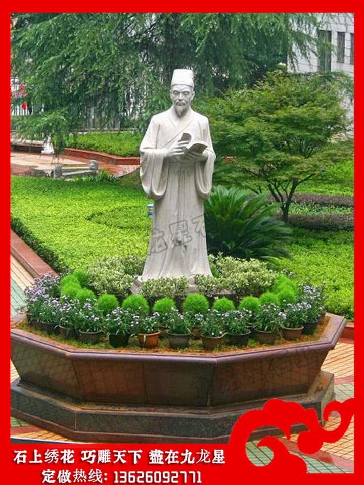 校園人物石雕的人物雕刻實際上來源于人們對于名人,偉人的一種欽慕之情,在古代的學堂,孔夫子就是擺放在教室的,以前是以一幅畫來展示,后來人們?yōu)榱烁尤?,更加細致,更加具體的了解到孔圣人,所以人們開始把他做成石雕,木雕,玻璃鋼雕,泥塑,樹脂雕等等。在西方,人們開始的人物大多以大理石來加工的,特別是后期在美術方面,大部分采用了石膏來代替石雕作品,讓雕刻品更加的潔白無瑕,但是石膏的作品穩(wěn)定性和耐久度并不能令人滿意,所以白色的漢白玉石雕一度成為代替石膏作品擺放在室外的一種重要裝飾工藝品,而漢白玉的石雕人物雕塑作品算是校園石雕中非常重要的一個組成部分,用細膩的雕刻手法完全可以還原人物的各種動作表情,并且不會顯得不夠自然。