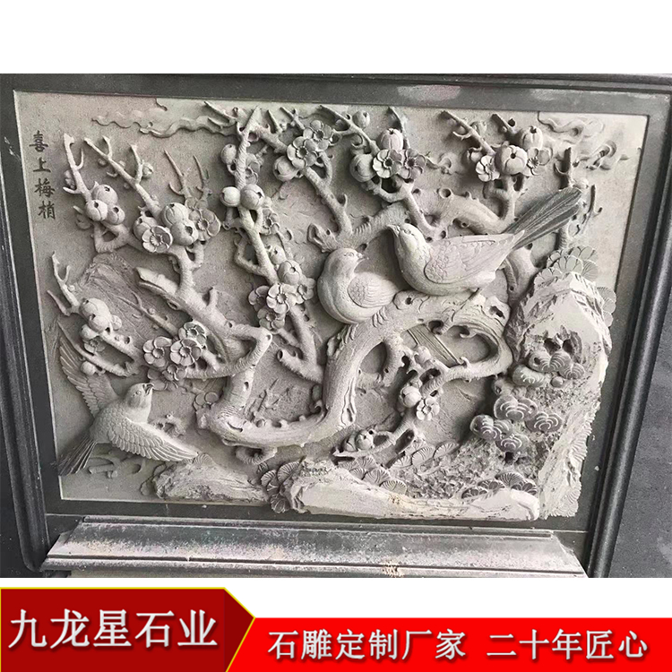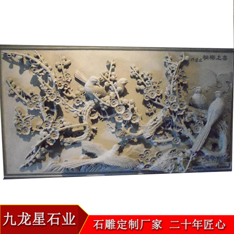 寺院喜上眉梢石浮雕是中國(guó)傳統(tǒng)吉祥紋樣之一。古人以喜鵲作為喜的象征。《開元天寶遺事》:“時(shí)人之家,聞鵲聲皆以為喜兆,故謂喜鵲報(bào)喜?!薄肚萁?jīng)》:“靈鵲兆喜”??梢娫缭谔扑螘r(shí)代即有此風(fēng)俗。當(dāng)時(shí)的銅鏡、織錦、書畫等,已有很多喜鵲的題材。同時(shí),我國(guó)人民以所喜愛的梅花諧音“眉”字,畫喜鵲站在梅花枝梢,即組成了“喜上眉(梅)梢”的石浮雕吉祥圖案。近代常見用于剪紙和木雕、石雕等上面。石雕浮雕仙鶴圖片大全也是浮雕壁畫中比較常見的一種圖案,通常雕刻在寺院墻面上或者庭院的照壁。