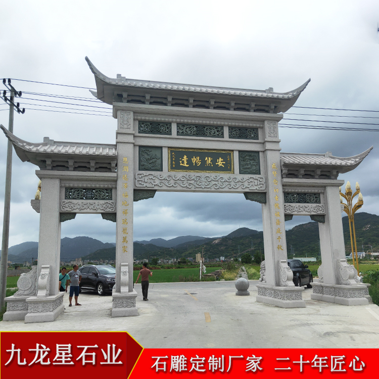村口石牌坊是建立在美麗鄉(xiāng)村莊村口的石牌坊,在打造美麗鄉(xiāng)村,農村達到小康水平,在美麗農村村頭都建立了村口石牌坊,村口牌坊不僅是美麗風景,更是一個大氣的地名標志,也叫農村標志牌坊。村口石牌坊樣式分為三門三樓,三門五樓,三門七樓和五門五樓,五門七樓,沖天式或三門沖天式的牌樓,還有就是一門一樓或三樓或三門三樓式的牌樓,因為這些石牌樓的造價成本都不是高,非常適合村口石牌坊的雕刻安裝,這也是很多農村都可以接受的原因。
