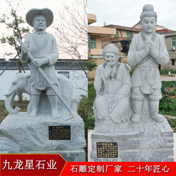 常見石雕二十四孝雕像價格及圖片——九龍星石業(yè),二十年匠心。孝作為中華民族的五倫之首,百善之先,早已深入人必,而石雕二十四孝作為孝 文化的典范,己內(nèi)化到民族性格里,百姓的日常生活與之緊密聯(lián)系在一起。孩提時代,石雕二十四孝就被作為啟蒙讀物,而送個時期所接觸到的讀物又往往對人生的 影響最為深遠(yuǎn);及至成人,為人處世上,或者自己要求自己以二十四孝孝子們?yōu)樾袆拥臉?biāo)桿。