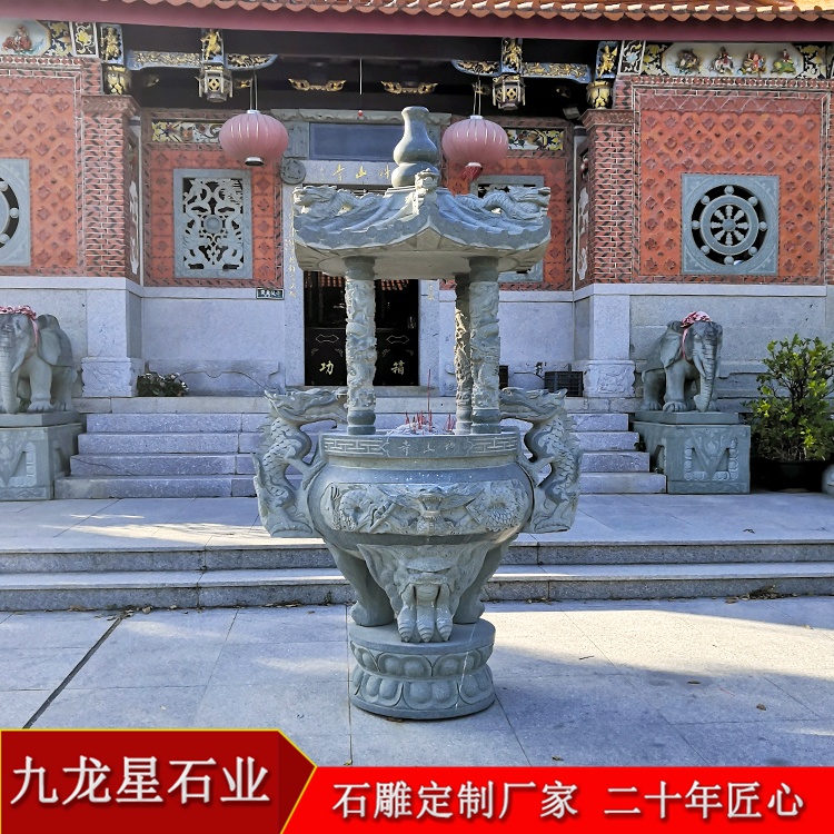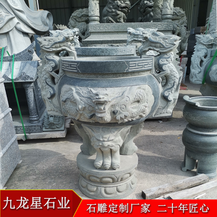 寺廟石雕帶蓋香爐 大型圓形平口香爐石雕——九龍星石業(yè)
