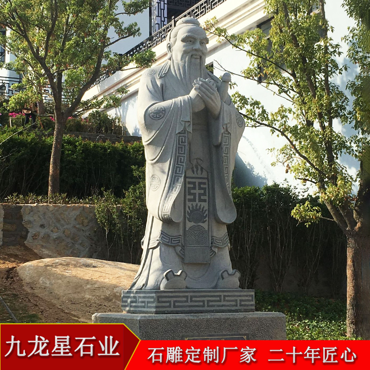 一般比較常見的白麻孔子像石雕塑有比較簡單的頭像,也有站姿的石雕像,基本上站立姿勢的石雕像選擇性更受到人們喜愛,有手里握著書卷拿在胸前,一手背在身后,抬頭挺胸,眼神眺望的石雕孔子像,也有將雙手交叉并在胸前,但是我們可以看到交疊的手是不露出大拇指的,象征著謙恭有禮,而四指并攏,也代表著四海之內(nèi)皆兄弟,有著友愛、友誼的象征意義。