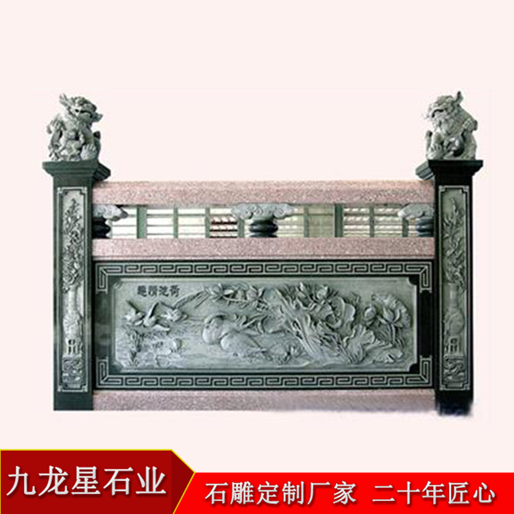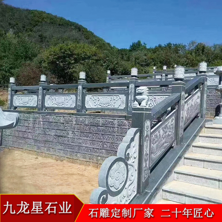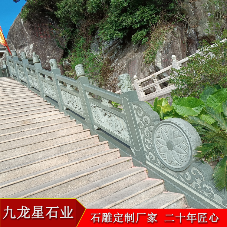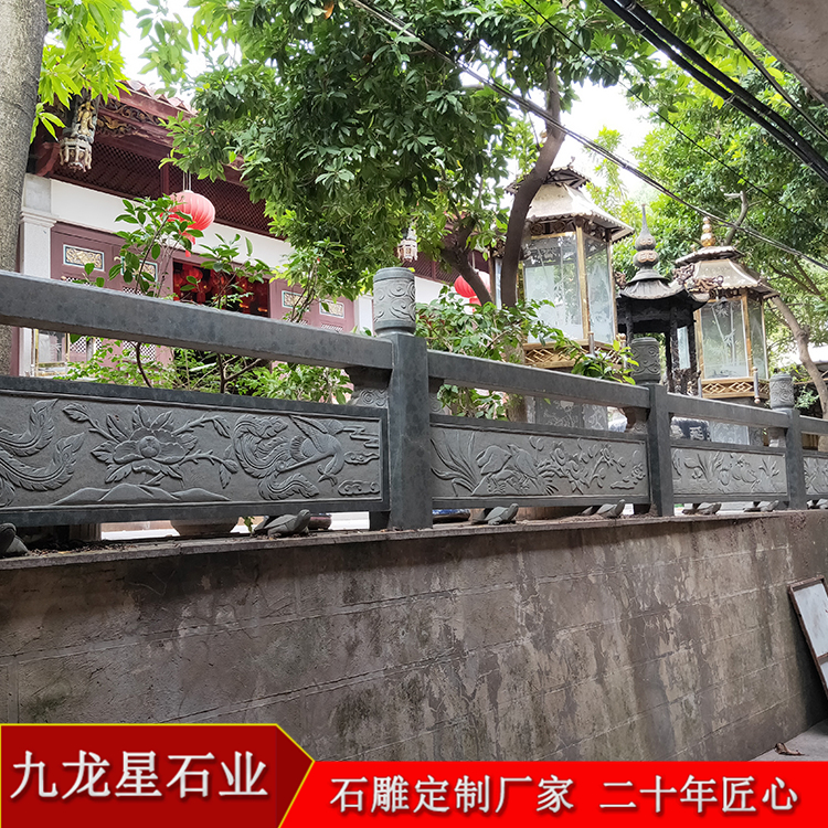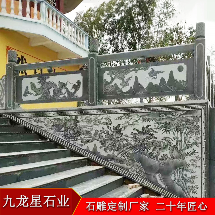 寺院青石護欄雕刻的浮雕裝飾重中之重就是石欄桿的欄板部位.往往浮雕以四季 花草、山水景觀、雙龍戲珠、龍鳳呈祥、歷史典故等浮雕或者線雕圖案,也有光 素無華的只有海棠線裝飾的石欄板。