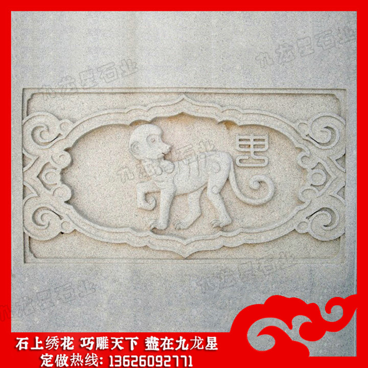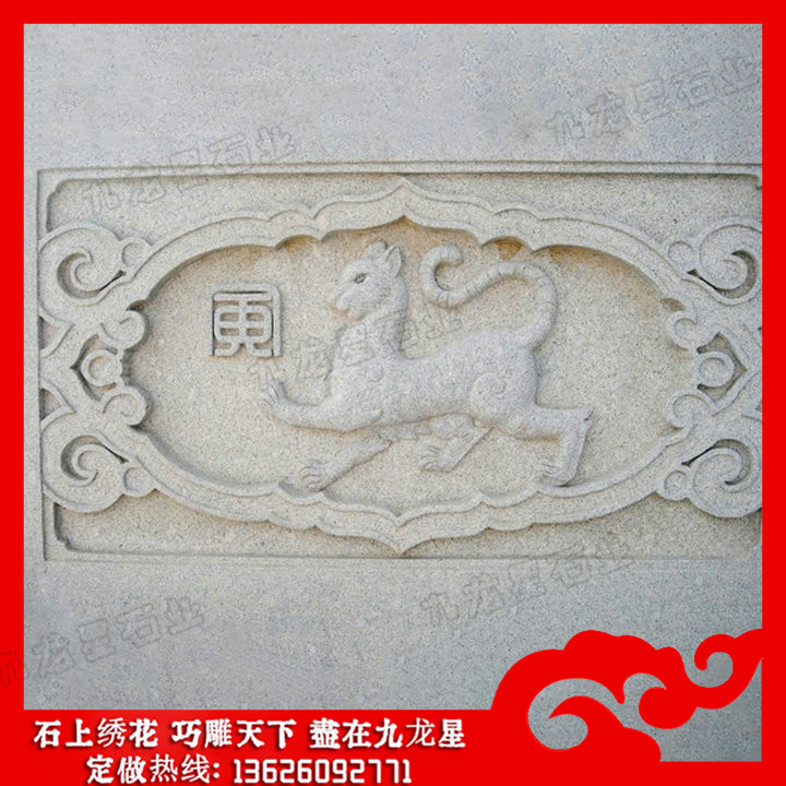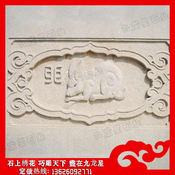 十二生肖石頭浮雕是中國與十二地支相配以人出生年份的十二種動物,包括鼠、牛、虎、兔、龍、蛇、馬、羊、猴、雞、狗、豬。十二生肖石頭浮雕隨著歷史文化的發(fā)展逐漸融合到相生相克的民間信仰觀念,是吉祥如意、美好愿望的表現(xiàn),十二生肖雕塑都有豐富的吉祥寓意,成為民間吉祥文化中的形象哲學(xué),現(xiàn)代,更多人把十二生肖雕塑作為春節(jié)的吉祥物,成為娛樂文化活動的象征。